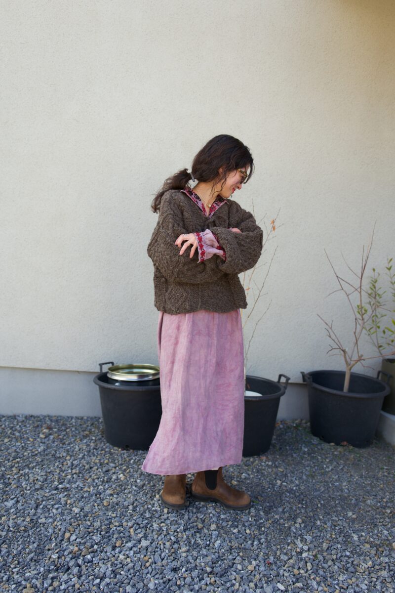 インドやネパールの手仕事のぬくもりを感じられるアパレルブランド・PUR。そんなPURで毎年人気のパッチワークニットを使ったコーデをスナップ! 鮮やかなラベンダーカラーのワンピにニットをレイヤードして、ほっこりと。足元はオーストラリア・タスマニア島生まれの老舗ブランド、ブランドストーンのブーツをセレクト。レザーブーツの品格を投入して、全体をシックにまとめています。