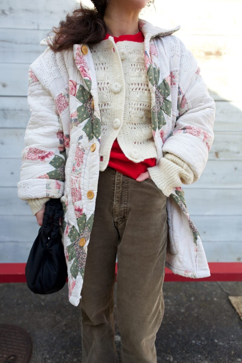 ヴィンテージらしい、個性的なキルティングジャケットをメインにスタイリング。インには、赤ニットと白カーデを重ね、最後にジャケットをON。センスあるレイヤードテクが光ります。ボトムは古着のコーデュロイパンツをチョイスして、少しメンズっぽい雰囲気に。シューズやバッグなどの小物は黒で統一して、キリッと引き締めています。