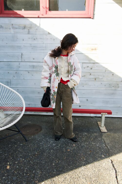 ヴィンテージらしい、個性的なキルティングジャケットをメインにスタイリング。インには、赤ニットと白カーデを重ね、最後にジャケットをON。センスあるレイヤードテクが光ります。ボトムは古着のコーデュロイパンツをチョイスして、少しメンズっぽい雰囲気に。シューズやバッグなどの小物は黒で統一して、キリッと引き締めています。