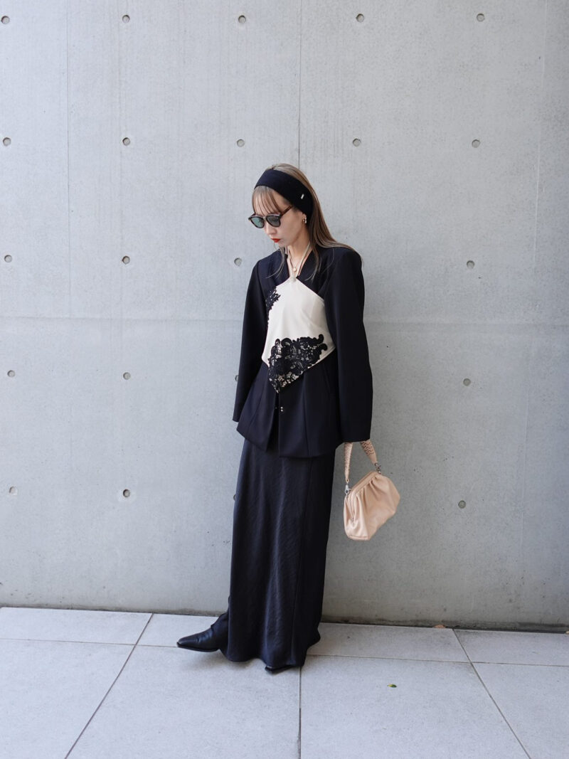 オールブラックの着こなしにベージュのアイテムを入れて、仕上げたコーデ。黒のジャケットとスカートをあわせて、クールにまとめたスタイルに、ベージュのビスチェをON。ジャケットの上からビスチェを重ねるスタイリングが新鮮です。バッグにもベージュを取り入れたことで、ほどよく女性らしさも漂います。