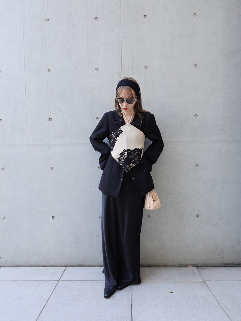 オールブラックの着こなしにベージュのアイテムを入れて、仕上げたコーデ。黒のジャケットとスカートをあわせて、クールにまとめたスタイルに、ベージュのビスチェをON。ジャケットの上からビスチェを重ねるスタイリングが新鮮です。バッグにもベージュを取り入れたことで、ほどよく女性らしさも漂います。