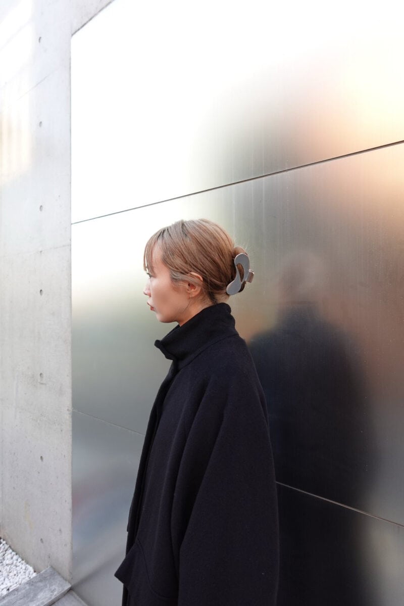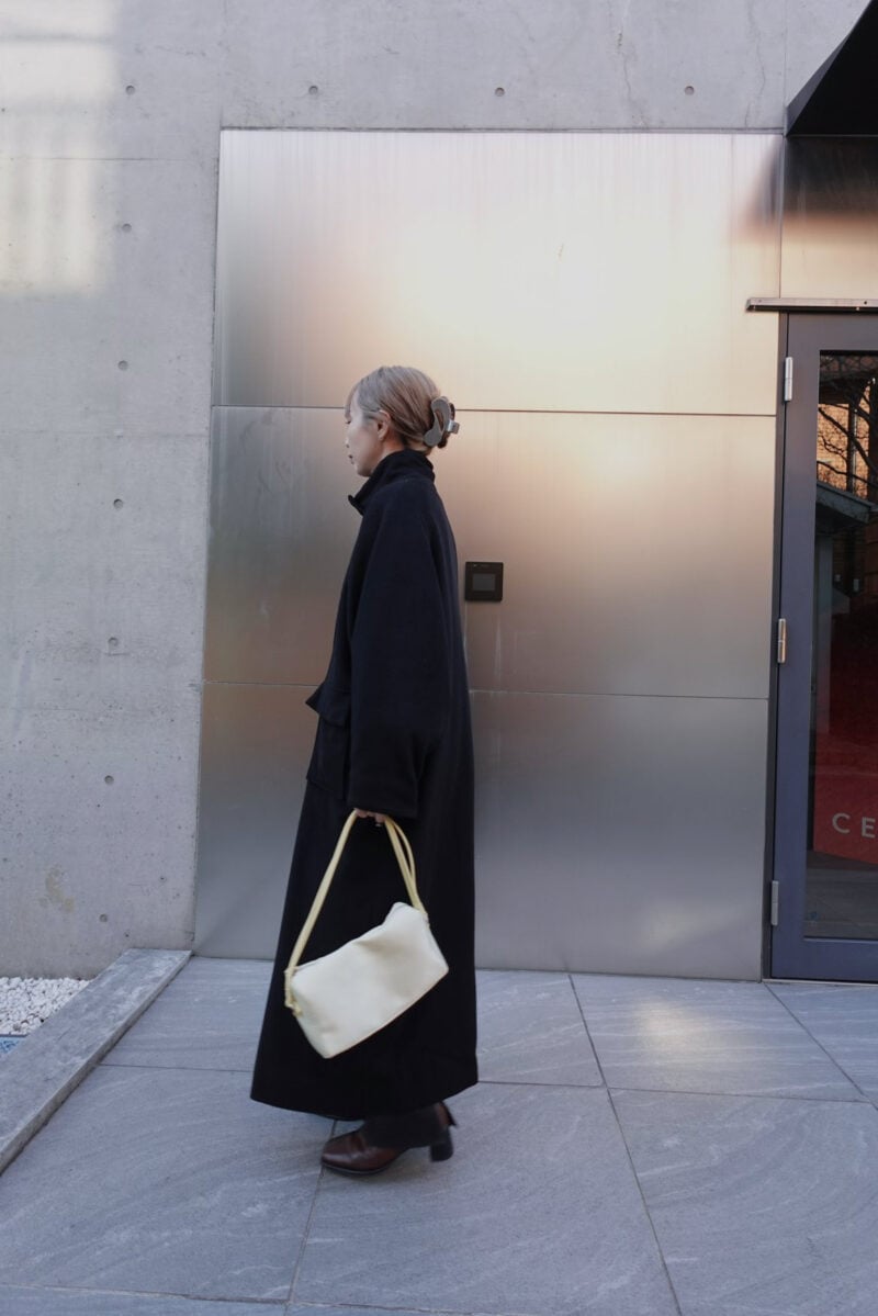 黒のロングコートで作るエレガントな冬の着こなしをスナップ。ミニマルにまとめたスタイルですが、デザイン性の高いクリップを使ってヘアをアレンジし、遊びをプラス。エクリュカラーのバッグを投入したのも、ポイントになっています。スマートながら品格のあるコーディネイトに仕上げています。