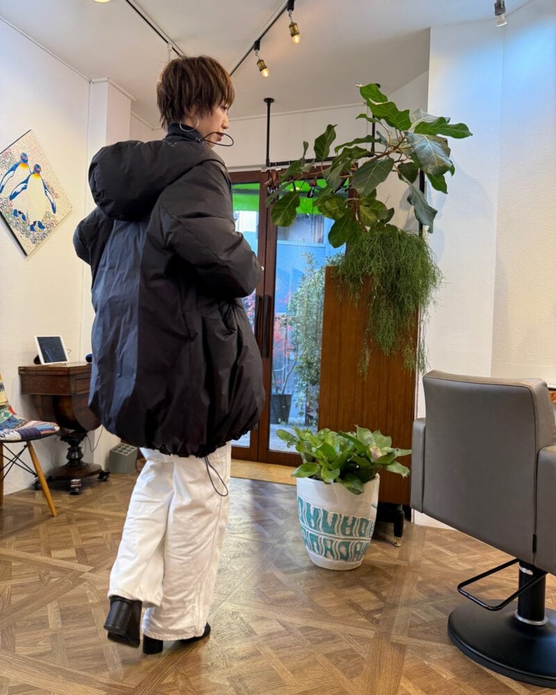 カジュアルに見えがちなオーバーオールを、モードに着こなした冬コーデ。オーバーオールは白、そのほかのアイテムを黒でまとめたのが大人見せのテクニックです。ニットは細身のタートル、シューズはMaison Margielaのタビブーツをセレクトし、さりげなくコーデを格上げしています。