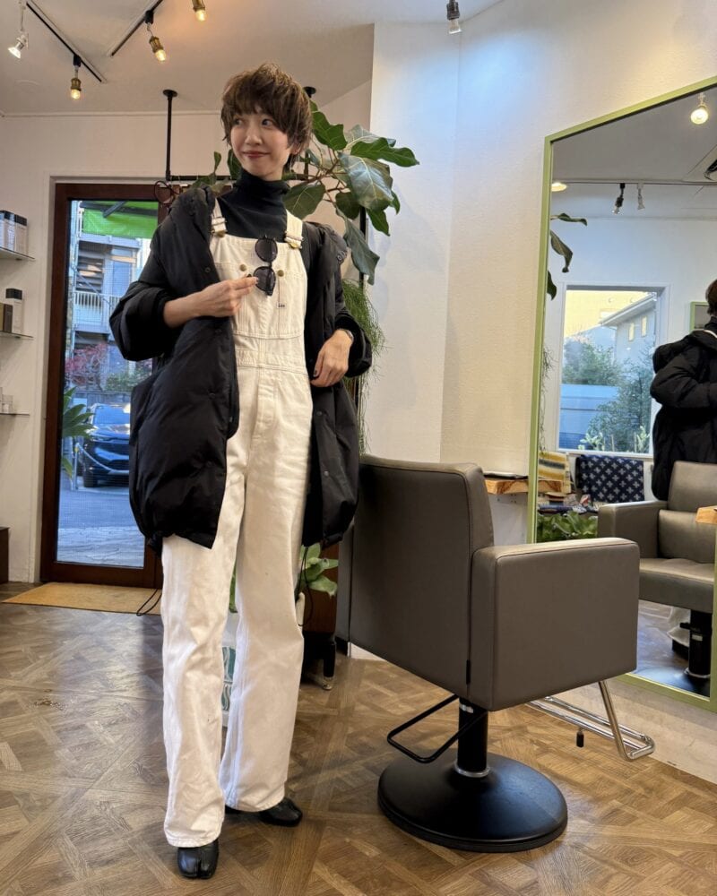 【30代スナップ】 Chaosのダウンとニットが決め手! オーバーオールを大人カジュアルにシフト