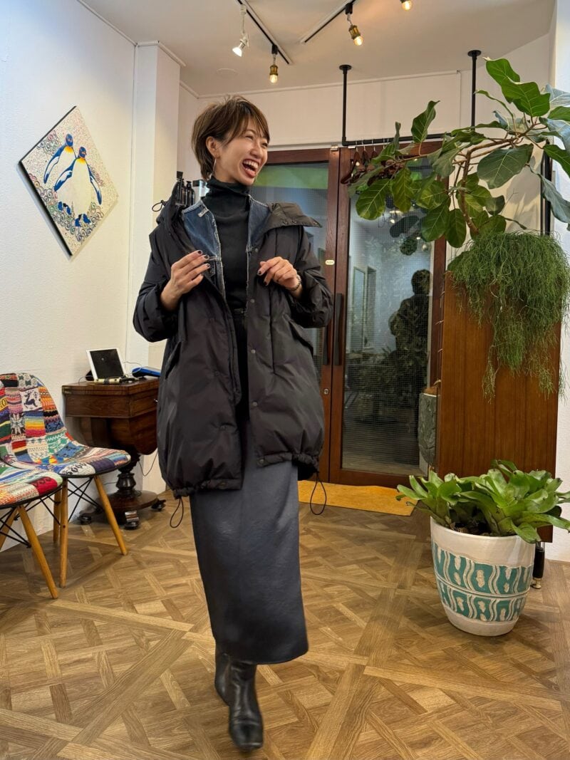ダウンコートは、細身ですっきりとしたシルエットを選ぶのがポイント。大人の着こなしにも合わせやすく、バランスがとりやすいので、おすすめです。ネイビーのタイトスカートを合わせることで、よりスタイリッシュにまとまります。ダウンの中には、デニムベストを入れ、カジュアルなニュアンスも投入。