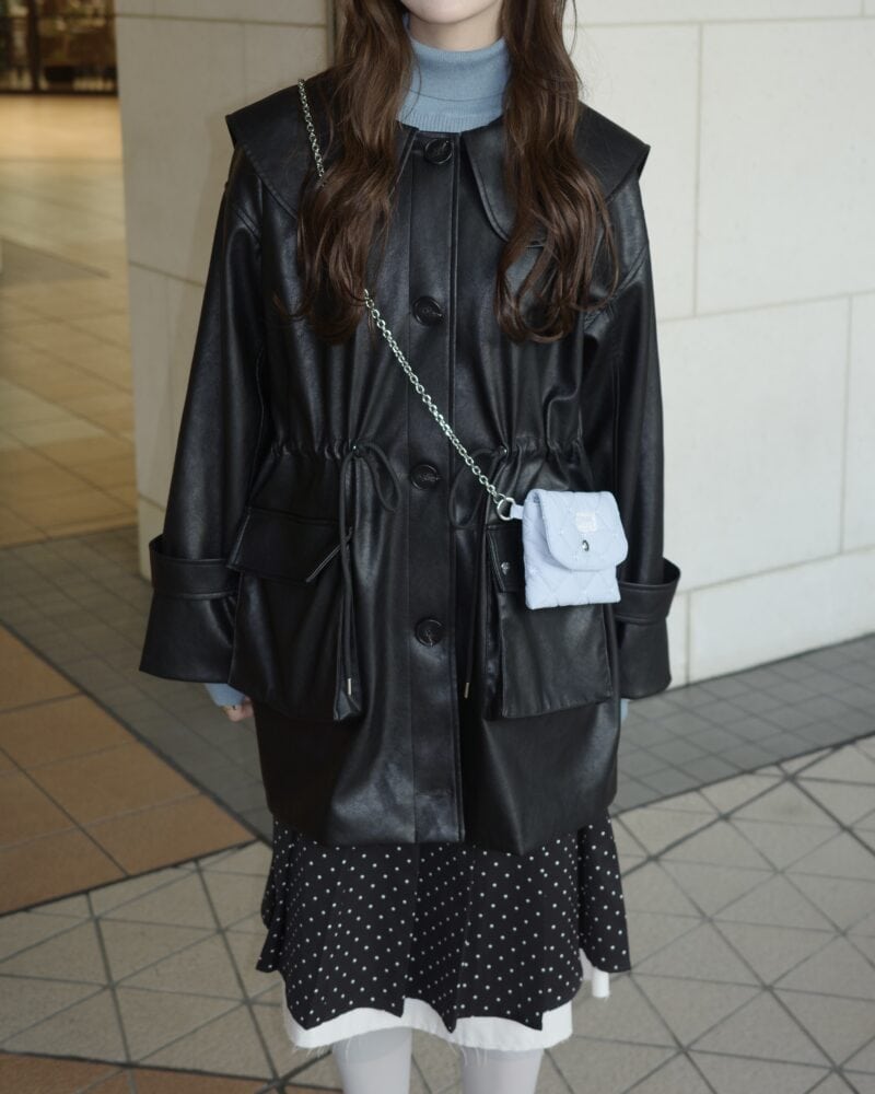 ダークトーンでまとまりがちな冬は、コーデがマンネリ化しやすい時季。そんなときは、差し色を上手に使うのがテクニック。ブラックアウターの中に、ブルーのタートルニットをあわせ、ソックスもブルーグレーをチョイスすれば、洒落感がグッと上がります。バッグも同系色のブルーを使えば、統一感を演出。さりげない色使いで着こなしをブラッシュアップできます。