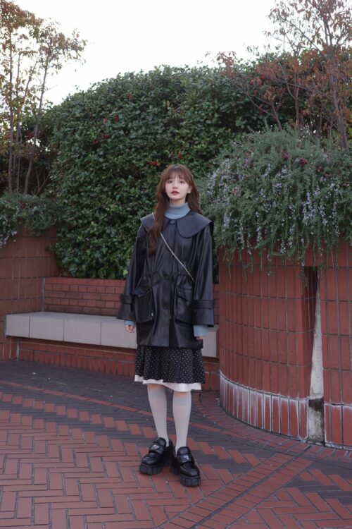 ダークトーンでまとまりがちな冬は、コーデがマンネリ化しやすい時季。そんなときは、差し色を上手に使うのがテクニック。ブラックアウターの中に、ブルーのタートルニットをあわせ、ソックスもブルーグレーをチョイスすれば、洒落感がグッと上がります。バッグも同系色のブルーを使えば、統一感を演出。さりげない色使いで着こなしをブラッシュアップできます。