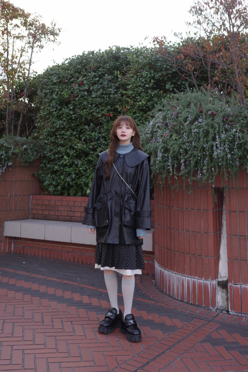 【30代スナップ】「靴下屋」のソックスと「moment+」のニットで色を投入! 冬のブラックコーデに映える差し色に注目