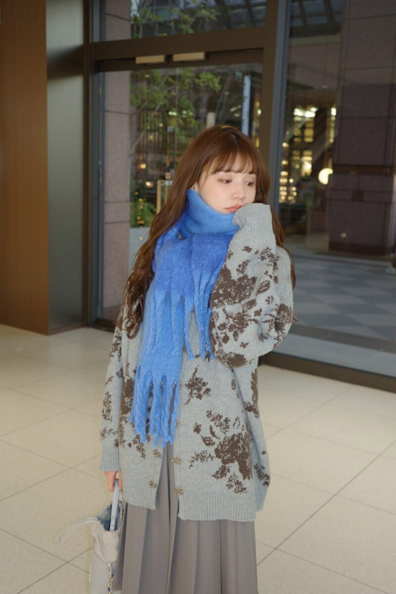 フラワープリントのカーデとプリーツスカートで作る、フェミニンなスタイリング。やさしげなライトグレーやブルーのアイテムを使って、女性らしさを引き出しています。idemのボリュームマフラーは鮮やかなブルーをセレクト。全体の着こなしのポイントにもなるし、ふんわりと巻くことで小顔効果も期待できます。