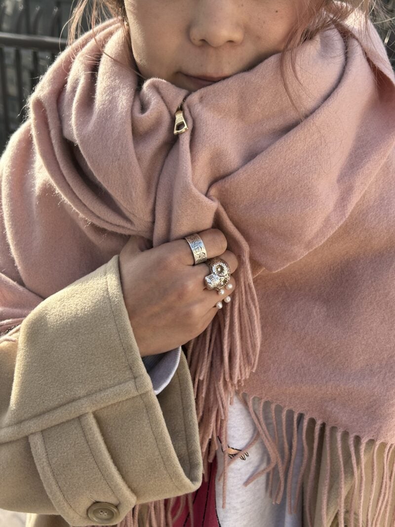 スウェットにデニム、スニーカーを組み合わせた、気取らないカジュアルスタイル。そこに、USEDのコートと旬ブランドのMeryll Roggeのマフラーを足して、大人っぽく仕上げています。さりげなくジュエリーを投入して、ラフに見えすぎないようにコーデを格上げしているのもポイントです。