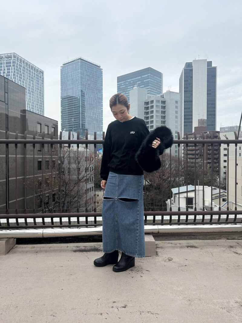 スウェットにデザイン性の高いデニムスカートをあわせた、カジュアル要素の高い着こなし。スウェットは、黒地にワンポイントが入っているシンプルなデザインを選び、ほかのアイテムもブラックで統一していることでスタイリッシュにまとまります。ファーバッグや厚底のブーツなど、キャッチーなアイテムを入れ、遊びも感じる上級コーディネイトです。