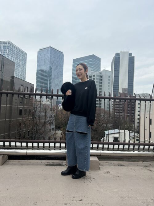 スウェットにデザイン性の高いデニムスカートをあわせた、カジュアル要素の高い着こなし。スウェットは、黒地にワンポイントが入っているシンプルなデザインを選び、ほかのアイテムもブラックで統一していることでスタイリッシュにまとまります。ファーバッグや厚底のブーツなど、キャッチーなアイテムを入れ、遊びも感じる上級コーディネイトです。