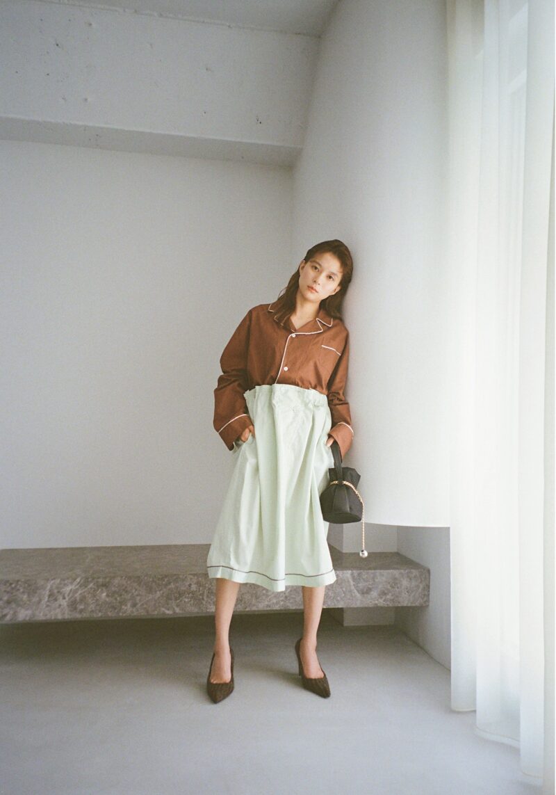 パジャマをアレンジしたルックはブラウンとミントグリーンの色合わせが新鮮。白のパイピングが効いたシャツは光沢感のある生地でドレッシーに。スカートはタックを寄せたリメイク風デザインがドレープを生み、控えめに華やかさを醸しだす。