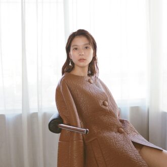 ボンディングレザーで仕立てたセットアップは、雰囲気のあるシボ感や切りっぱなしの裾がほんのりラフなムード。ジャケットのシルエットが曲線的なオーバーサイズなのに対し、スカートは思い切りコンパクトというバランスも絶妙。