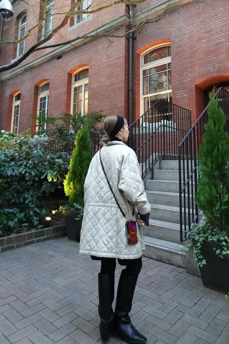 独特の風合いのキルティングコートは、古着ならではの魅力を感じる1枚。中に着たタートルニットはユニクロのもの。ベーシックな黒を選べば着回しも利くので、おすすめです。ショートパンツとロングブーツの組み合わせで、好バランスなコーディネイトを完成させています。