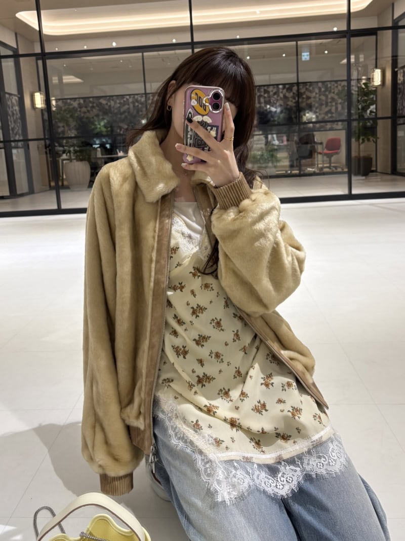 ファーアウターとキャミソールを使って、ほどよく甘さを取り入れたデニムスタイル。春を感じさせるフラワープリントのサテンキャミは、キュートなレース使いにも注目。ストレートのデニムパンツとコンバースのスニーカーを合わせて、カジュアルに仕上げています。
