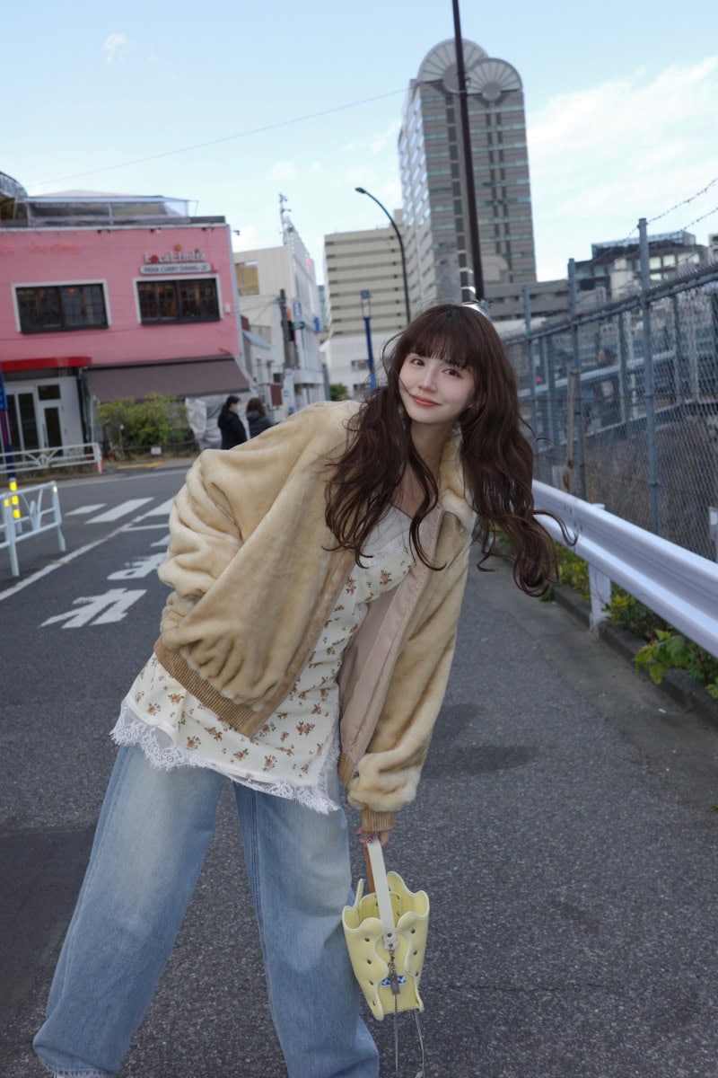 ファーアウターとキャミソールを使って、ほどよく甘さを取り入れたデニムスタイル。春を感じさせるフラワープリントのサテンキャミは、キュートなレース使いにも注目。ストレートのデニムパンツとコンバースのスニーカーを合わせて、カジュアルに仕上げています。