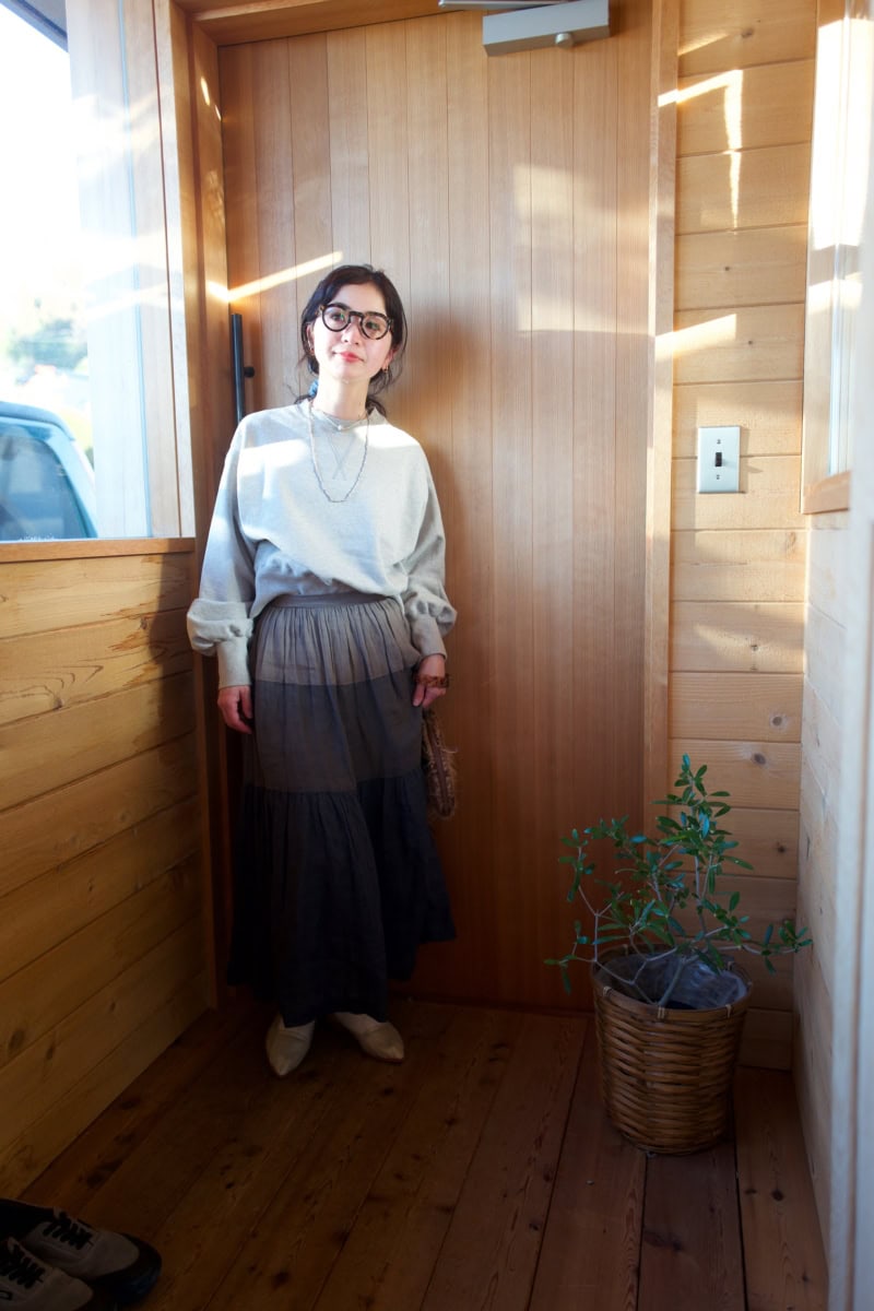 スウェットにフレアスカートをあわせた軽やかな装い。ロングのフレアスカートは、寒色系の配色が美しく、洒落感のある1枚。ボリューミーなパフスリデザインのトップスとの組み合わせで、大人のガーリーカジュアルに。アクセサリーや模様入りタイツを取り入れて、フェミニンさを底上げ。