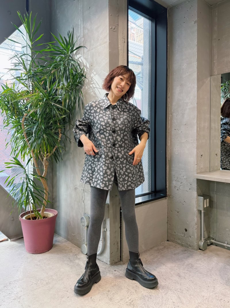 ロングジャケットとショートパンツで作る、大人のカジュアルコーデ。インパクトのある総柄ジャケットが都会的な雰囲気。ショートパンツが隠れるくらいのロングな丈感のおかげて、幼くならずこなれた印象に。全体のトーンをシックにまとめているのも、スタイリングのカギ。