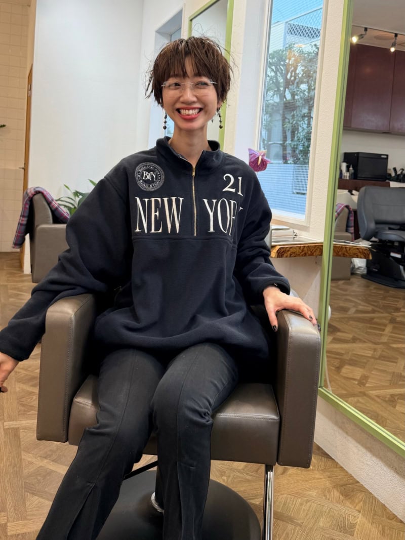 ロゴフリースにパンツをあわせた、スポーツテイストを感じるコーディネイト。裾スリット入りのパンツがスマートな印象を演出し、素足にパンプスの足元が洗練度をアップ。アクセントに投入した、韓国ブランド「BLUE ELEPHANT」のアイウェアもポイント。ラフさの中にもシティな雰囲気が漂うスタイリングです。