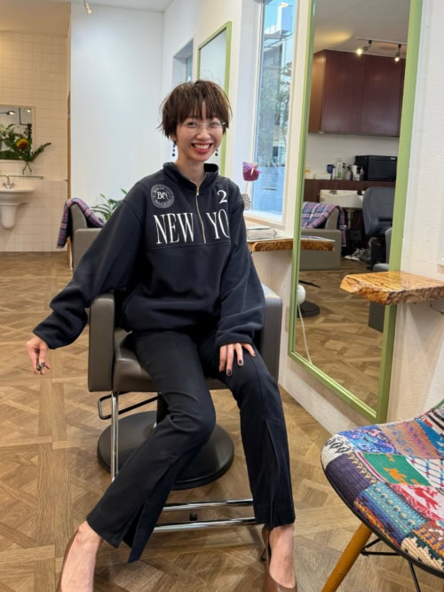 ロゴフリースにパンツをあわせた、スポーツテイストを感じるコーディネイト。裾スリット入りのパンツがスマートな印象を演出し、素足にパンプスの足元が洗練度をアップ。アクセントに投入した、韓国ブランド「BLUE ELEPHANT」のアイウェアもポイント。ラフさの中にもシティな雰囲気が漂うスタイリングです。