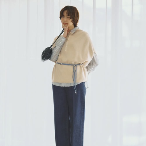 程よいゆとりがありつつも、やや深めの股上とすっきりとしたヒップ周りで好スタイルに見せられる。高めのウエストベルトでより脚長を狙って。デニム¥39, 600、サンダル¥137, 000(ともにエブール/リトルリーグ インク) 3wayニットジレ¥19, 800、ベルト¥34,100(ともにプントヴィータ/サロン アダム エ ロペ) ストライプシャツ¥44, 660(テラ/ティースクエア プレスルーム) ソックス¥2,750(ブルーフォレ/リトルリーグ インク) バッグ¥35,200(ナッシング リトゥン/オデット エ オディール新宿店)