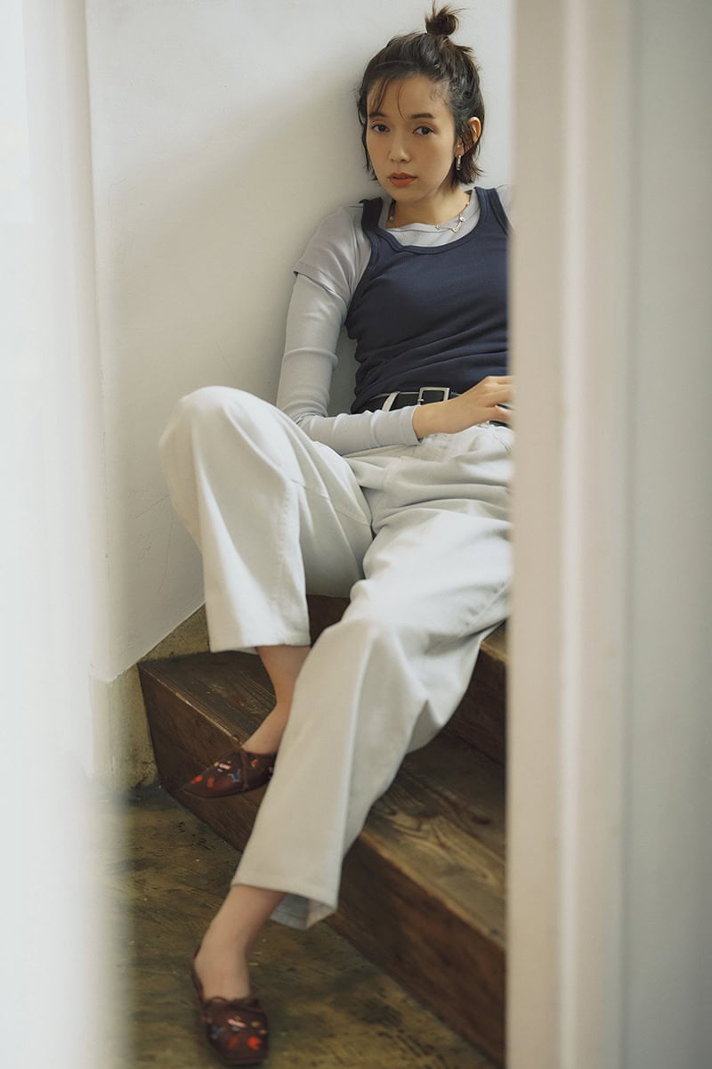 クリーンなムードを保ちつつも、ニュアンスたっぷりのライトグレーが大人カジュアルになじむ。デニムパンツ¥17,600(アンヌーク/アンヌーク 新宿ルミネ2店) レイヤードトップス¥31,900(アンスクリア/RHC ロンハーマン) ネックレス¥39,600(ハルポ/ロンハーマン) カフリング¥24,200(フミエタナカ/ドール) ベルト¥12,980(オブラダ/シンチ) ピアス¥3,960(ミミサンジュウサン/サンポークリエイト) シューズ¥38,500(ピッピシック/ベイジュ)
