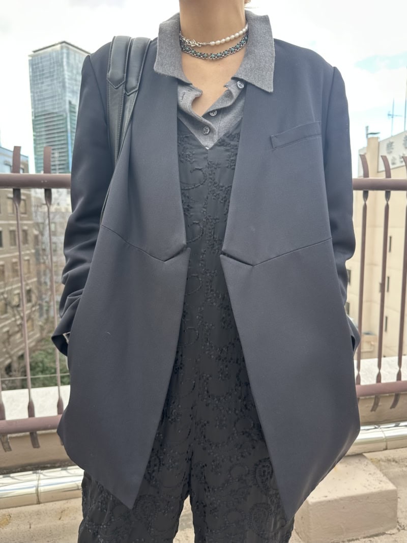 女性らしさのある刺しゅう入りオールインワンで作る、ジャケットスタイル。かっちりした雰囲気になるので、足元はスニーカーで抜けをプラスしています。