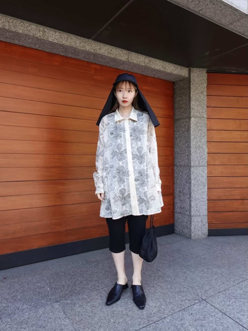 刺しゅうシャツを使った春らしいスタイル。キャップやパンツ、シューズは黒で統一して、モノトーンでまとめてクールに仕上げています。