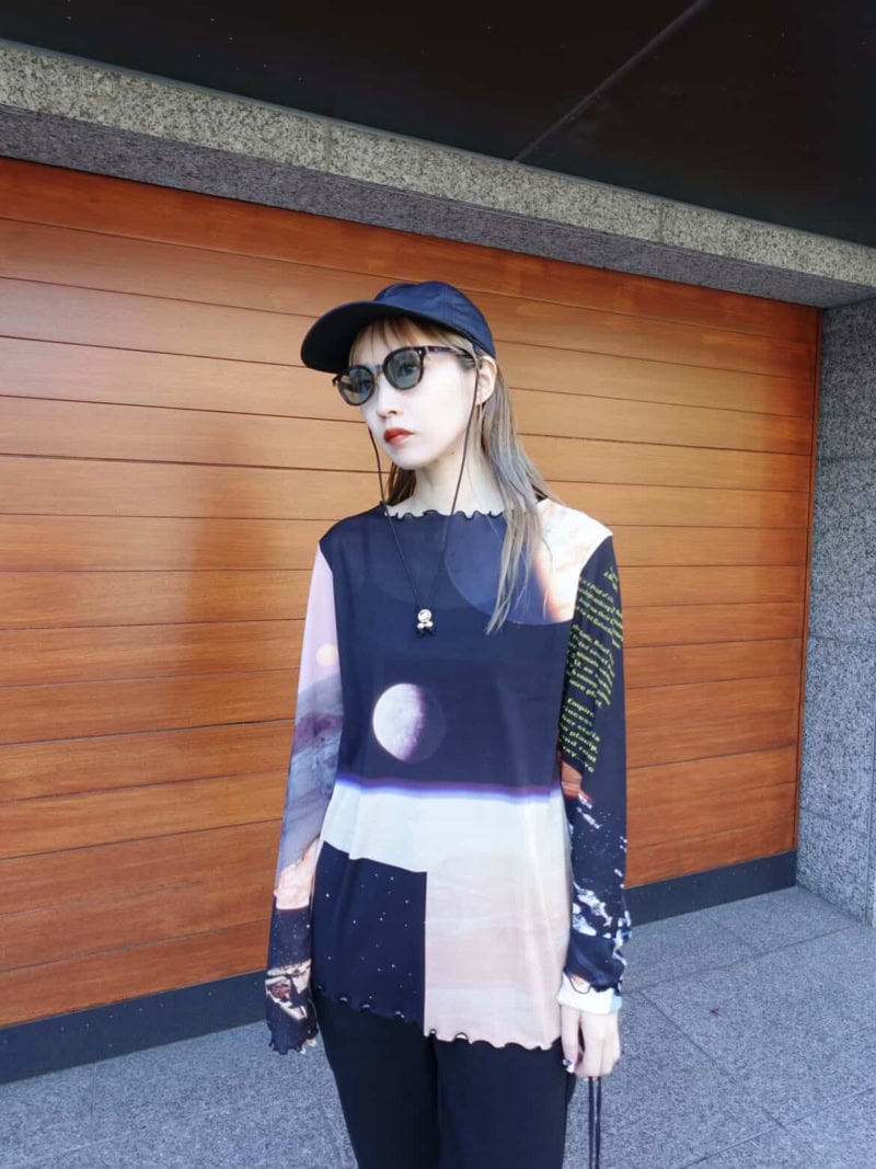 全体をブラックで統一してモードな印象に。個性的なプリントのカットソーを主役に、サングラスやキャップを足してカジュアルに仕上げています。
