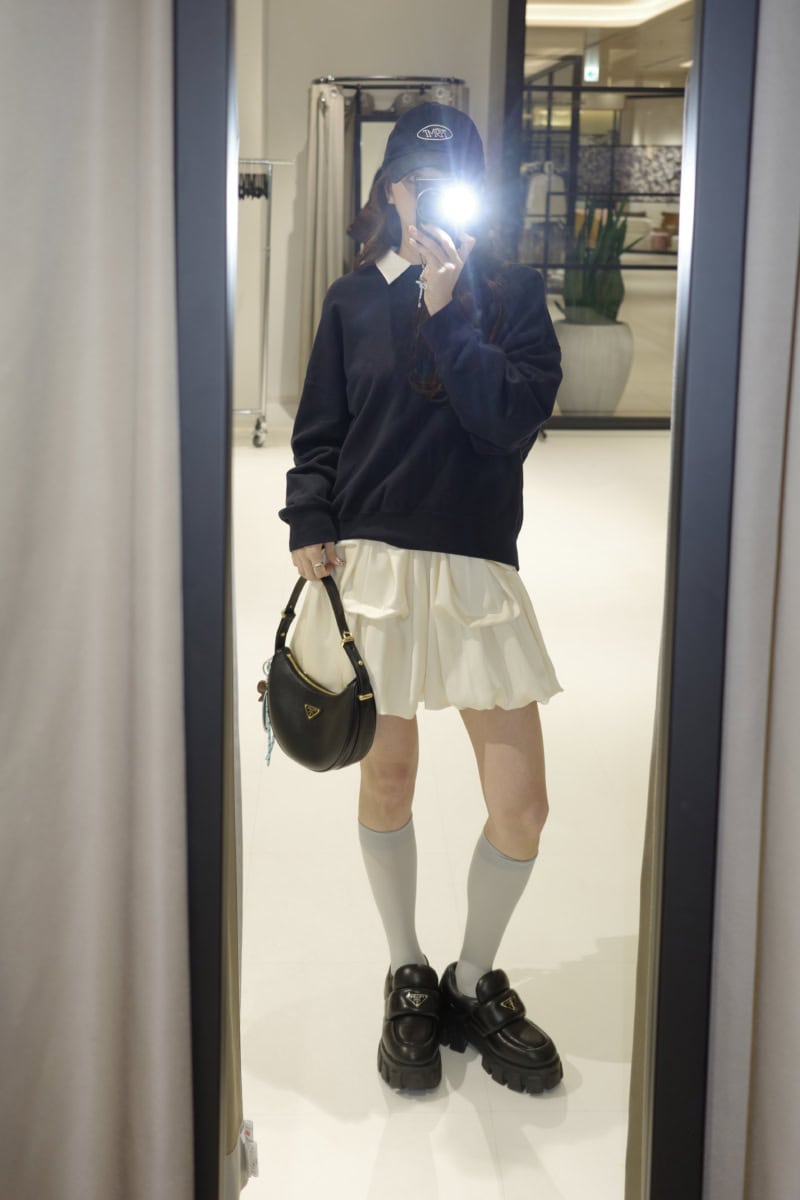 【30代スナップ】ユニクロのスウェット&シャツが活躍! バルーンミニスカとあわせて韓国風スタイルに