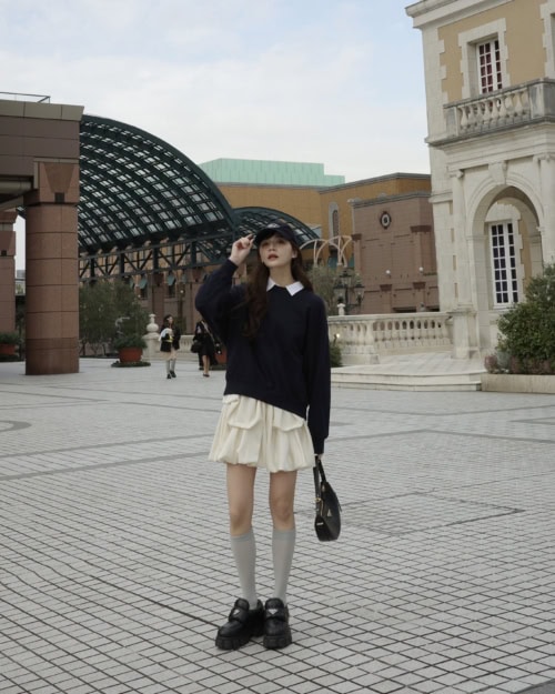 【30代スナップ】ユニクロのスウェット&シャツが活躍! バルーンミニスカとあわせて韓国風スタイルに