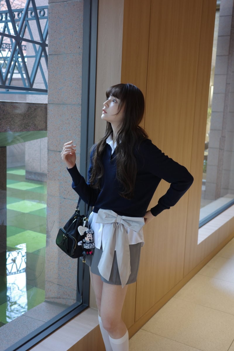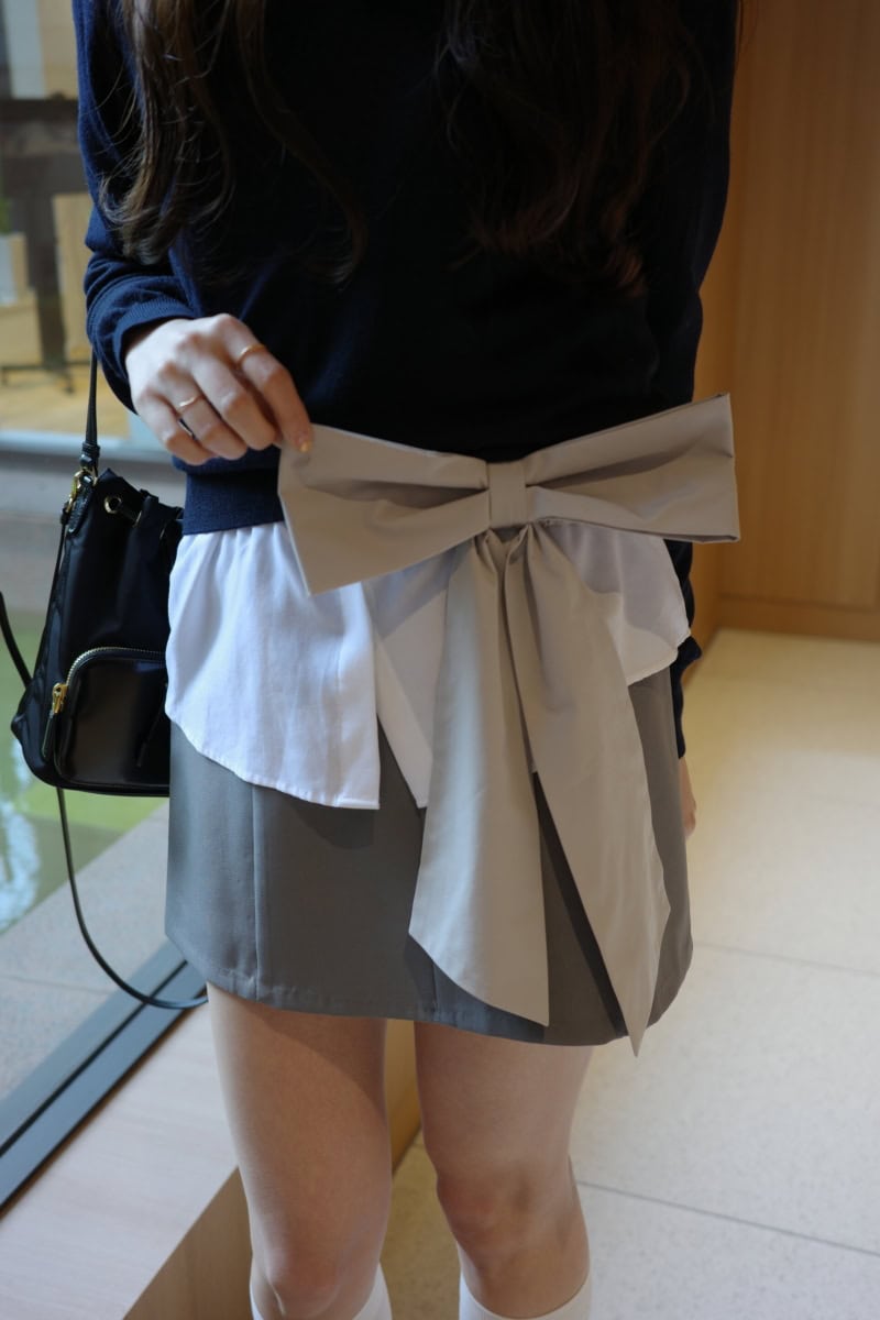 高見えすると話題の、ユニクロのポロニットを使ったコーデ。 中には同じくユニクロの白シャツを入れて、クリーンに。リボンベルトをアクセントに使っているのもチャーミングです。