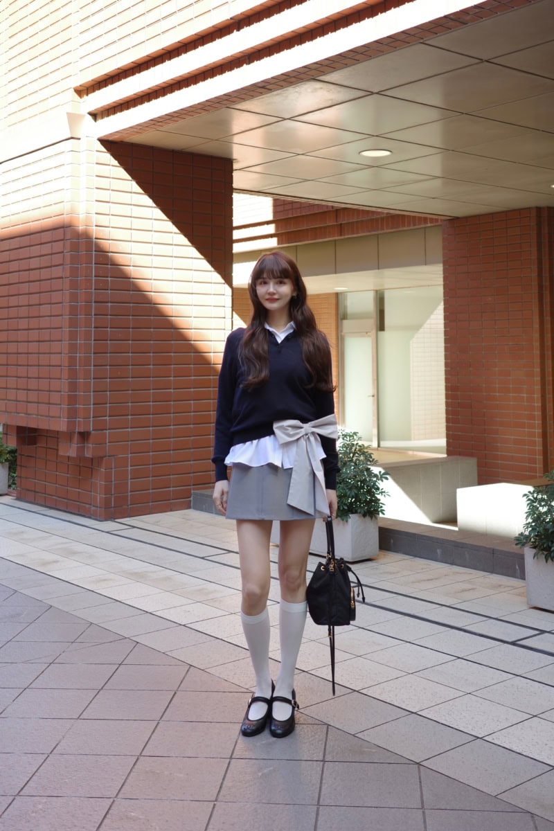 高見えすると話題の、ユニクロのポロニットを使ったコーデ。 中には同じくユニクロの白シャツを入れて、クリーンに。リボンベルトをアクセントに使っているのもチャーミングです。