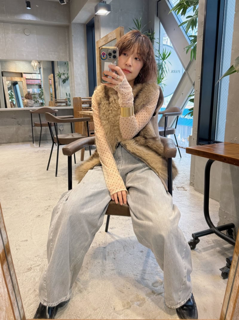 シアートップスにファーベストをレイヤードした、トレンド感あふれる着こなし。ストレートデニムのラフさを適度におさえ、洗練された大人のカジュアルスタイルに昇華しています。
