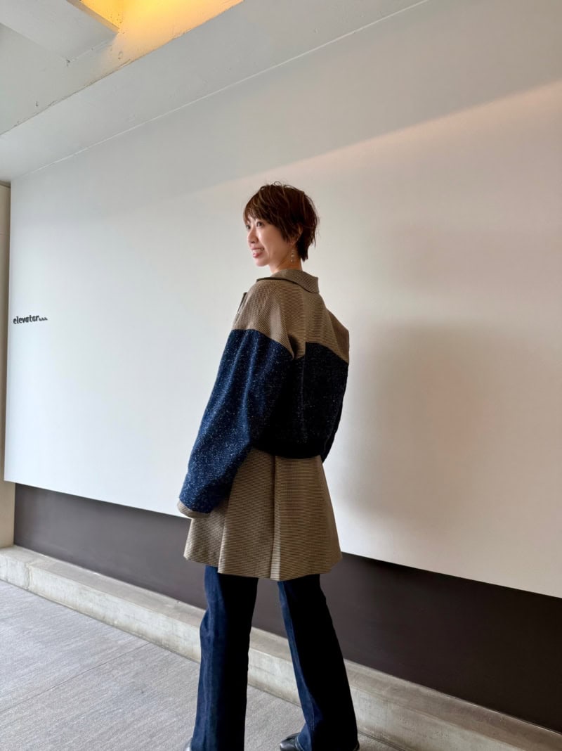 ジャケット×スカートのセットアップを使った、感度の高いコーディネイト。ジャケットがネイビー×ベージュのバイカラーなので、中にはユニクロのニットやデニムパンツを入れ、色の統一感を出しています。