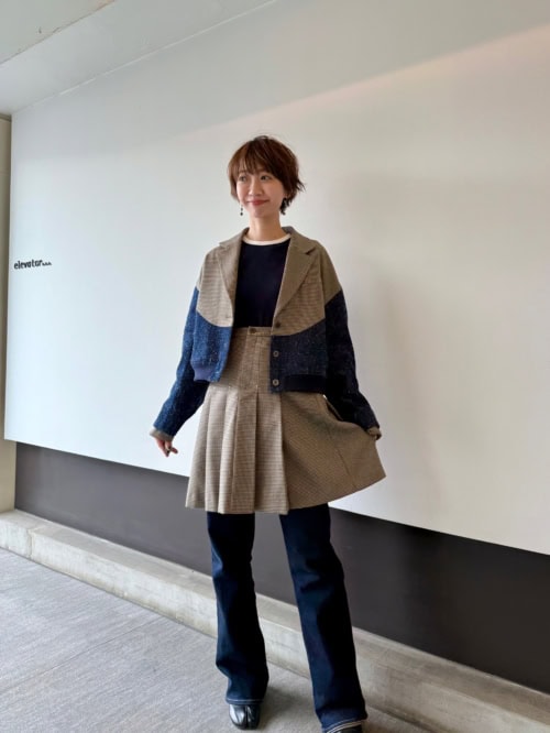 ジャケット×スカートのセットアップを使った、感度の高いコーディネイト。ジャケットがネイビー×ベージュのバイカラーなので、中にはユニクロのニットやデニムパンツを入れ、色の統一感を出しています。