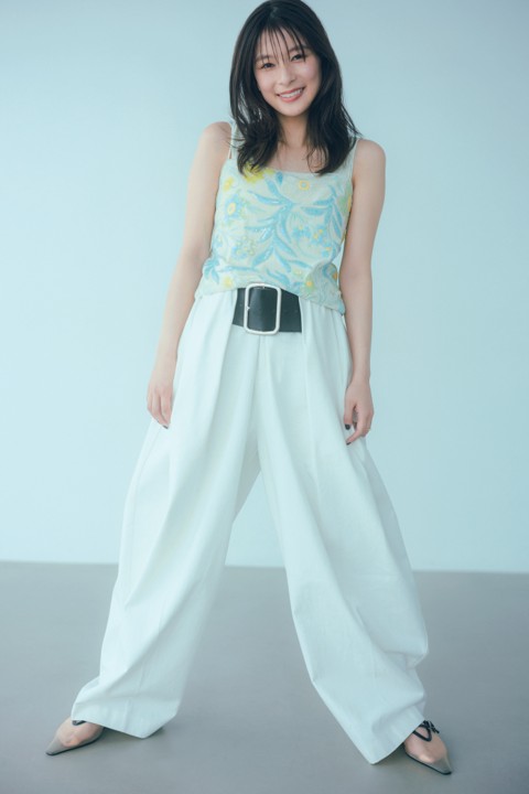 ビスチェ¥33,000(バウム・ウンド・へルガーデン/S&T) パンツ¥26,400(プランクプロジェクト/プランクプロジェクト 青山店) リング¥220,000~(トーカティブ/トーカティブ 表参道) シューズ¥49,500(サロンデジュ/オデット エ オディール 新宿店) 中に着たタンクトップ(スタイリスト私物)