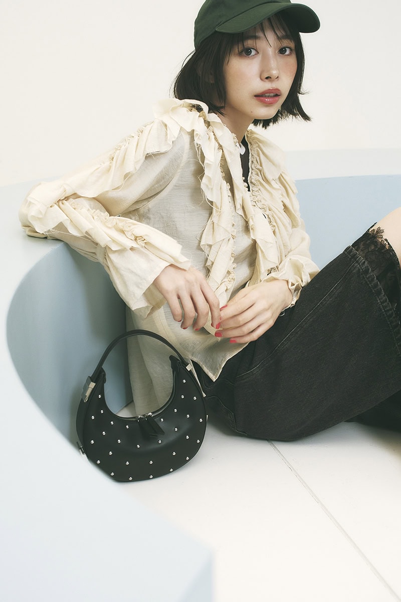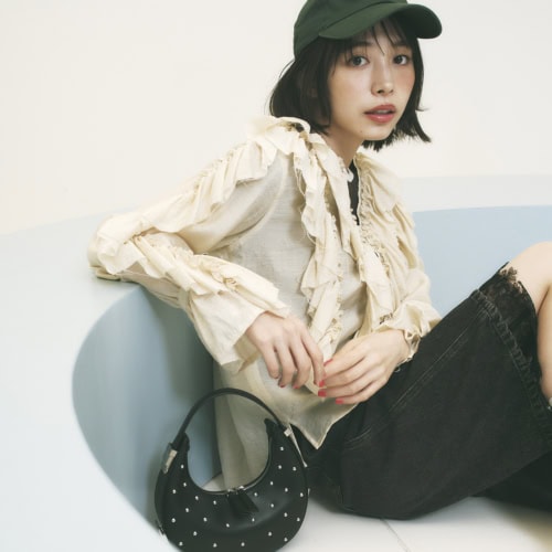ふわふわとしたボリュームフリルがドラマティックに着映えるブラウスが主役。適度にシアーで軽やかな印象に映るから、デニムボトムやキャップでカジュアルに引き寄せるのもお洒落。ブラウス¥28,000(シーニュ) ブラウンTシャツ¥4,400(シップス エニィ/シップス インフォメーションセンター) レイヤードデニムハーフパンツ¥18,920(メゾンスペシャル/メゾンスペシャル 青山店) キャップ¥7,920(オブラダ/シンチ) バッグ¥52,800(OSOI/OSOI SHINJUKU)