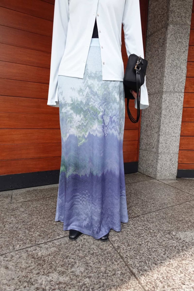 大胆なアートプリントのロングスカートがコーデの主役。スカートにあわせて、ペールブルーのカーデや同系ブルーのスカーフをヘッドアクセ風に巻いて、統一感を出しています。