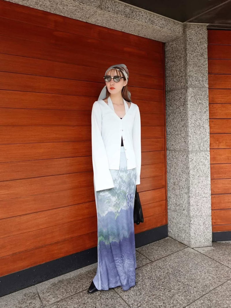 大胆なアートプリントのロングスカートがコーデの主役。スカートにあわせて、ペールブルーのカーデや同系ブルーのスカーフをヘッドアクセ風に巻いて、統一感を出しています。