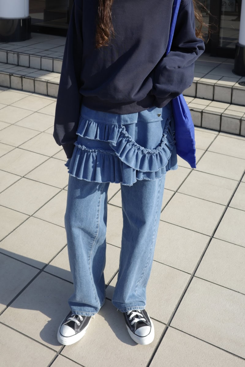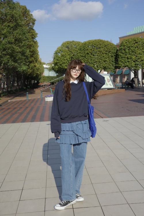 スウェットトップスとデニムアイテムで作る、スタンダードなカジュアルスタイル。デニムパンツ×デニムミニスカをレイヤードにして、洒落感を意識。さらに、全体をネイビーでまとめたので大人っぽく仕上がります。