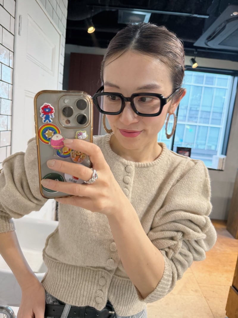 ニュアンスカラーのカーディガンと、淡色のデニムパンツを組み合わせたミニマムな着こなし。メガネやベルト、アクセサリーを足して、大人らしい品格のあるコーデに仕上げています。