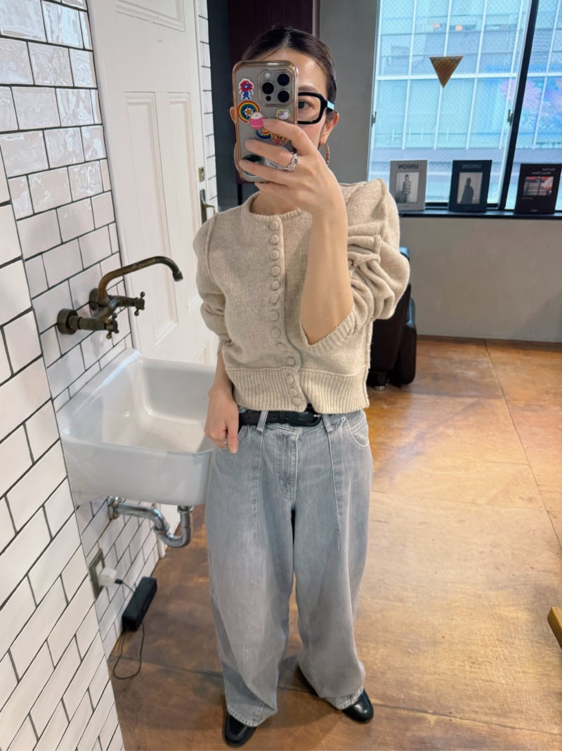 ニュアンスカラーのカーディガンと、淡色のデニムパンツを組み合わせたミニマムな着こなし。メガネやベルト、アクセサリーを足して、大人らしい品格のあるコーデに仕上げています。