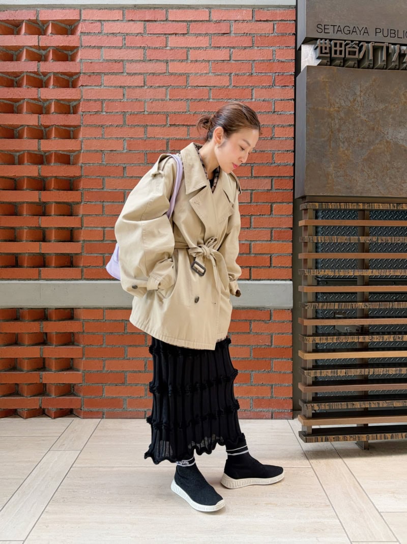 シルエットが特徴的な「CLANE」のトレンチコートに、デザインが可愛い黒スカートをあわせたお出かけコーデ。シックな着こなしながら、バッグでライトパープルを取り入れ、キャッチーに。