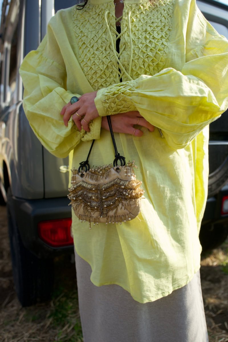 春気分を味わえるレモンイエローのブラウスをメインにした、カジュアルコーデ。ブラウスがチュニック丈なので、スウェット地のロングスカートともバランスよくまとまります。