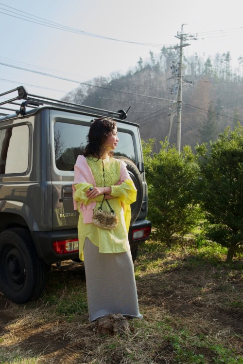 春気分を味わえるレモンイエローのブラウスをメインにした、カジュアルコーデ。ブラウスがチュニック丈なので、スウェット地のロングスカートともバランスよくまとまります。