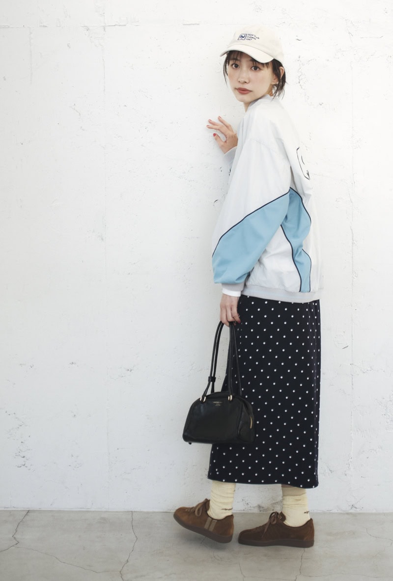凛としたすっきりシルエットのドット柄スカートで大人っぽく着地。スカート¥26,180(オブラダ/シンチ) Vネックトップス¥17,930(メゾンスペシャル/メゾンスペシャル 青山店) Tシャツ¥17,600(RHC/RHC ロンハーマン) キャップ¥4,950(タマニワ/ジャーナル スタンダード レリューム ルミネ新宿店) バッグ¥35,200(クリスチャン ヴィラ/ピモンテ) ソックス¥1,320(靴下屋/タビオ) 別注スニーカー¥18,700(パトリック フォー オデット エ オディール/オデット エ オディール 新宿店)