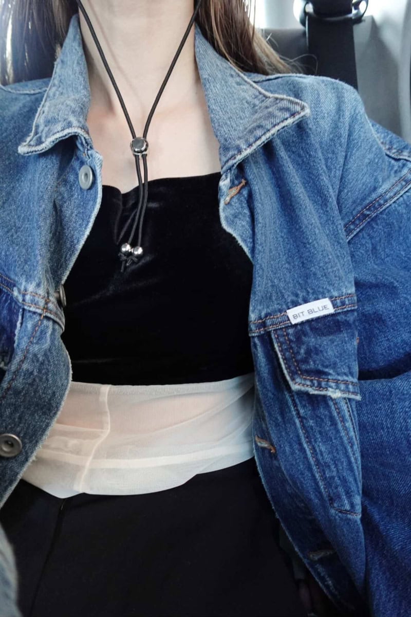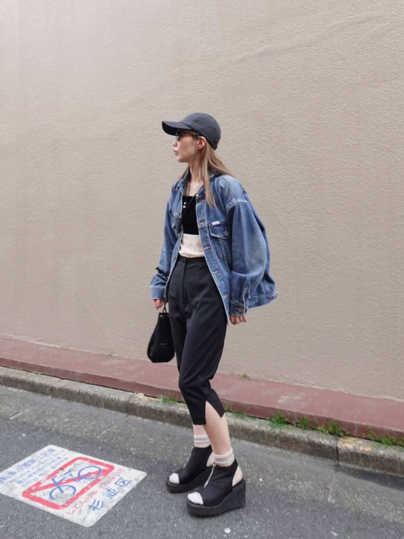 ゆったりしたデニムジャケットとカプリパンツを組み合わせて、重心のバランスをとったカジュアルスタイル。ルーズに見えないように、黒アイテムを多めに使って引き締めています。