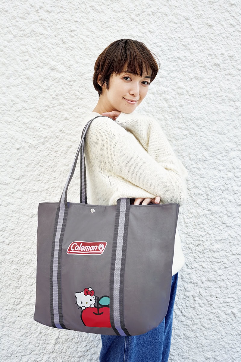 赤いりんごにつかまる愛らしいハローキティとコールマンの赤ロゴがアクセントになったトートバッグは持つだけで気分がアガる!ニット¥18,700(サロン アダム エ ロペ) パンツ¥29,920(オブラダ/シンチ)